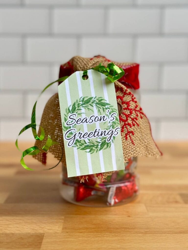 I created 5 different designs to give you options for everyone on your list. Some say “Merry Christmas,” some say “Happy Holidays,” and others say “Season’s Greetings,” so you can choose whichever greeting feels right for each person. They’re the perfect finishing touch to turn an inexpensive gift into something that feels special and intentional.